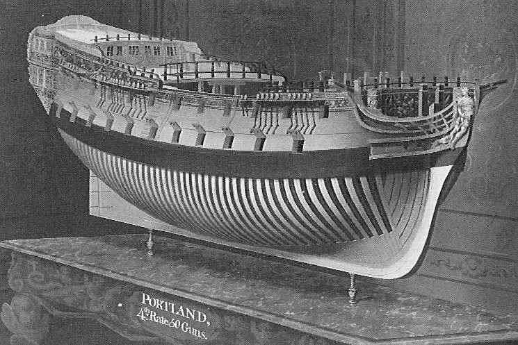 Although for most navy a thing of the past, too small to stand in the line of battle, but lacking the speed of the frigate, the Royal Navy continued ordering 50 gun ships also during the Napoleonic wars. During the American Revolutionary War, the Royal Navy was in need of ships with fairly heavy batteries to bear upon coastal targets and a certain troopcarrying capacity. A task, for which frigates would be too small and only the 50 gun ship was able to operate in the shallow waters of the North American coasts. Therefore as a ship of the Portland class (Williams design 1767) the Leopard was ordered in 1775, partly built in Portsmouth Dyd in 1776 and then stopped. Then the frames remained rotting in the open for some years. In 1785 the frames where taken to Sherness Dyd, and the work continued. In 1790 HMS Leopard was finally being launched. |